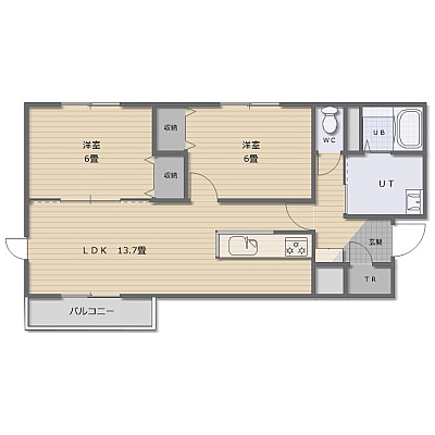 2LDK(58.74m²)└ LDK13.7帖 洋室6帖 洋室6帖