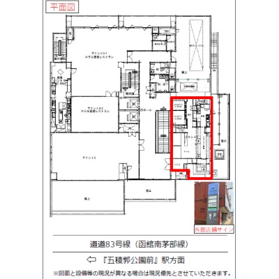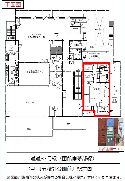 ここに注目!【内覧可能物件です】函館市電「五稜郭公園前」駅まで徒歩2分!函館市の中心地「本町」に、魅力的な店舗物件が登場しました。 ホテルマイステイズ函館五稜郭の2階に位置し、駅からのアクセスは良好。周辺は商業施設や飲食店が充実した賑わいと利便性を兼ね備えたエリアです。幹線道路沿い、商店街に面しており、お客様の目に留まりやすい好立地が事業を後押しします。 広々89.62㎡の店舗スペースは南西向きで開放感があり、エレベーター完備で快適にご利用いただけます。飲食業全般に対応可能で、重飲食のご相談も承ります。さらに、寿司店仕様の厨房機器設備等を含む造作譲渡(180万円)も可能。早期の開業をご希望の方にもおすすめです。 照明器具、ガス・給排水設備、視認性の良い袖看板も有り設置可能です。 この人気のエリアで、新たなビジネスチャンスを掴みませんか? ※造作譲渡は現賃借人様との直接交渉となります。定期借家契約ですが、契約年数は相談可能です。まずはお気軽にお問い合わせください。