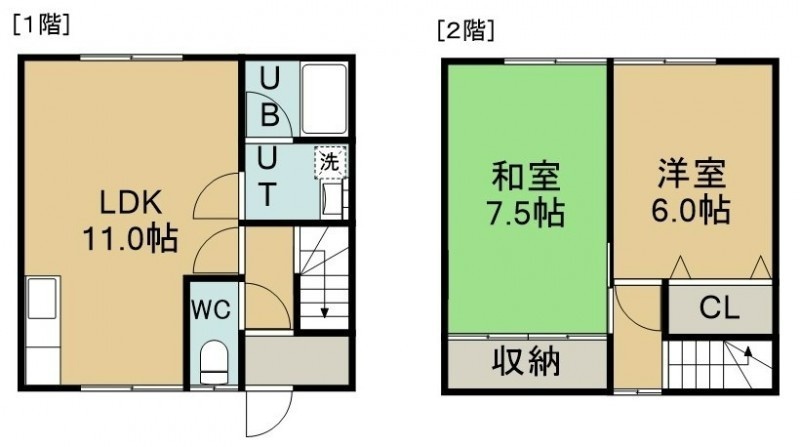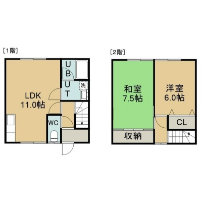 2LDK(61.15m²)└ 1階:LDK11帖 / 2階:和室7.5帖 洋室6帖