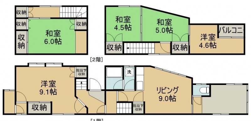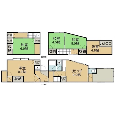 5DK(106.2m²)└ 1階:DK9帖 洋室9.1帖 / 2階:洋室4.6帖 和室6帖 和室5帖 和室4.5帖