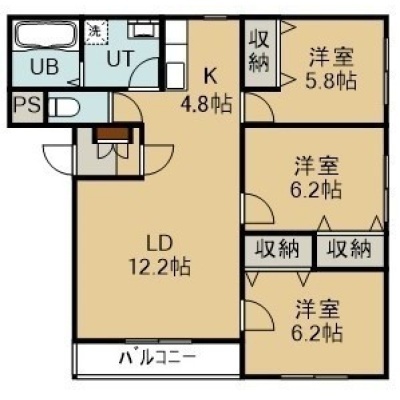 3LDK(71.6m²)└ 3階:LDK17帖 洋室6.2帖 洋室6.2帖 洋室5.8帖