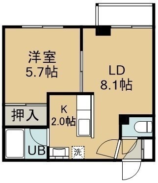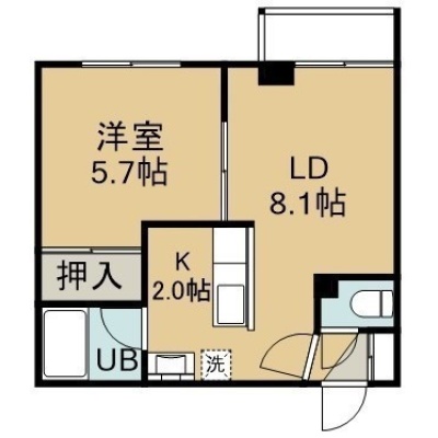 1LDK(32.88m²)└ 2階:LD8.1帖 K2帖 洋室5.7帖