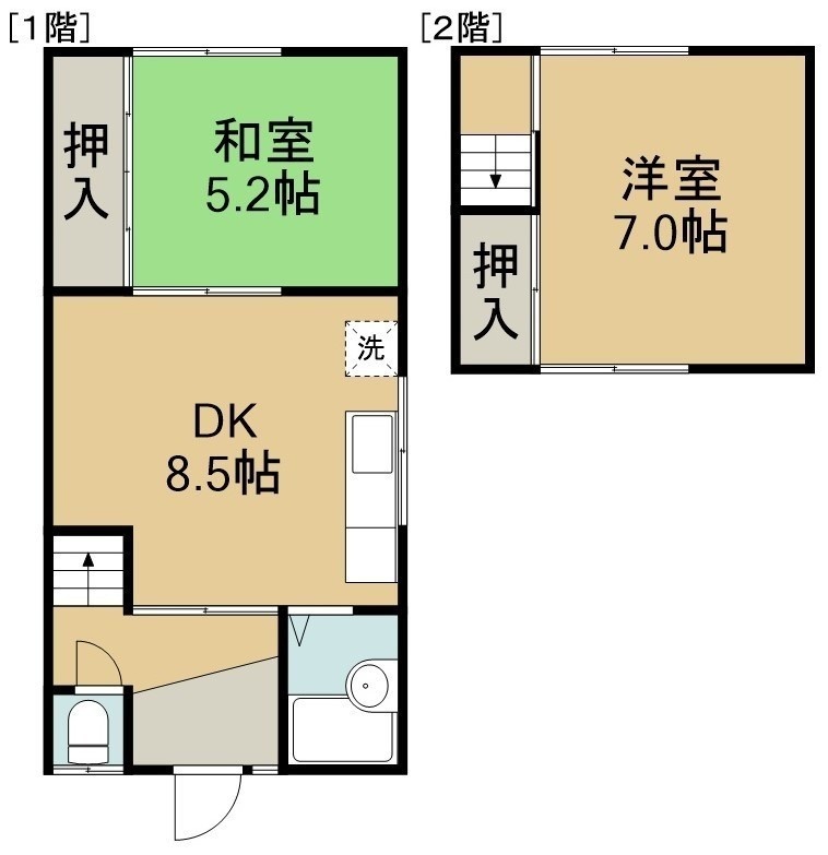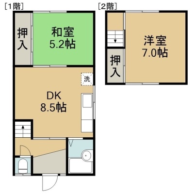 2DK(47m²)└ 1階:DK8.5帖 和室5.2帖 / 2階:洋室7帖