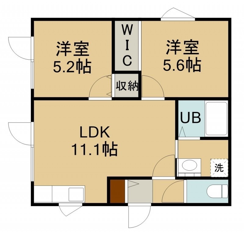 2LDK(48.96m²)└ 1階:LDK11.1帖 洋室5.6帖 洋室5.2帖