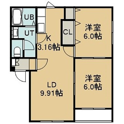 2LDK(52.58m²)└ 2階:LD9.91帖 K3.16帖 洋室6帖 洋室6帖