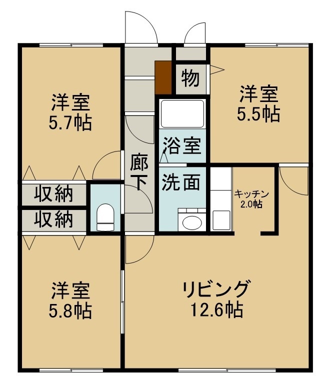 3LDK(72m²)└ 2階:LD12.6帖 K2帖 洋室5.8帖 洋室5.7帖 洋室5.5帖