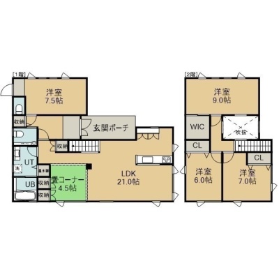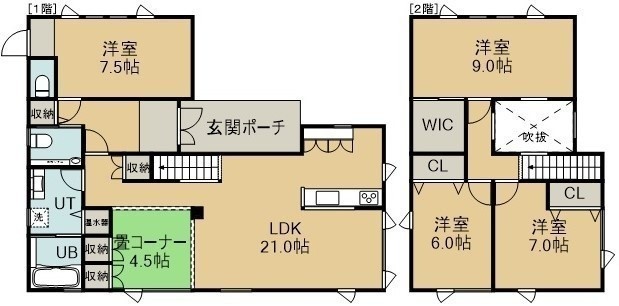 4LDK(129.17m²)└ 1階:LDK21帖 洋室7.5帖 / 2階:洋室9帖 洋室7帖 洋室6帖