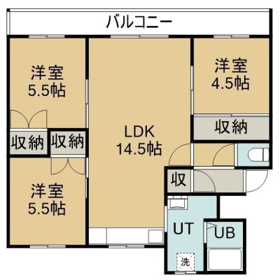 3LDK(65.35m²)└ 2階:LDK14.5帖 洋室5.5帖 洋室5.5帖 洋室4.5帖