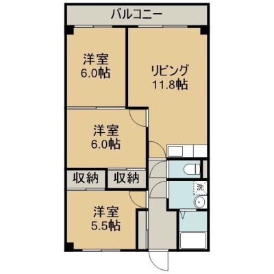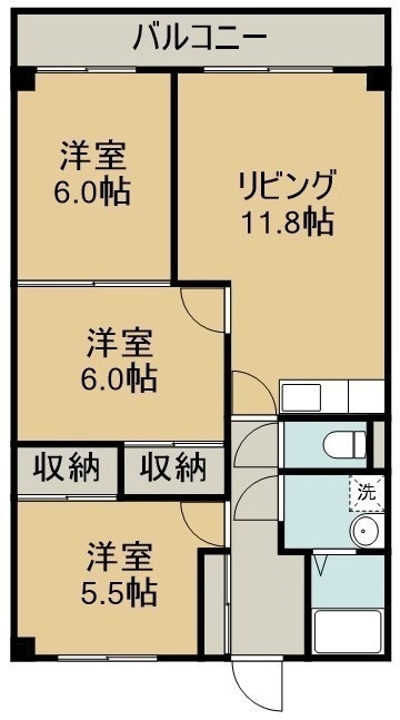 3LDK(58.62m²)└ 3階:LDK11.8帖 洋室6帖 洋室6帖 洋室5.5帖