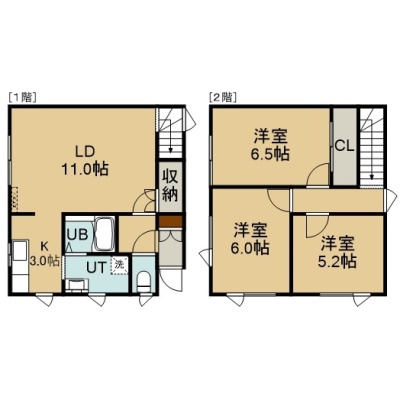 3LDK(73.54m²)└ 1階:LD11帖 K3帖 / 2階:洋室6.5帖 洋室6帖 洋室5.2帖