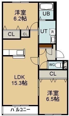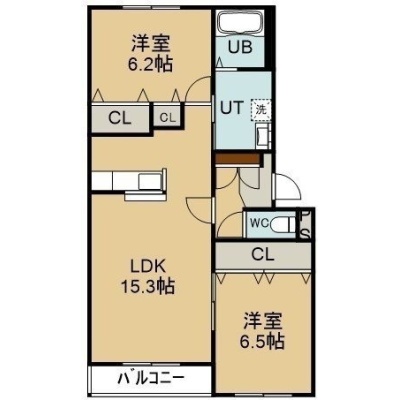 2LDK(65.46m²)└ 1階:LDK15.3帖 洋室6.5帖 洋室6.2帖