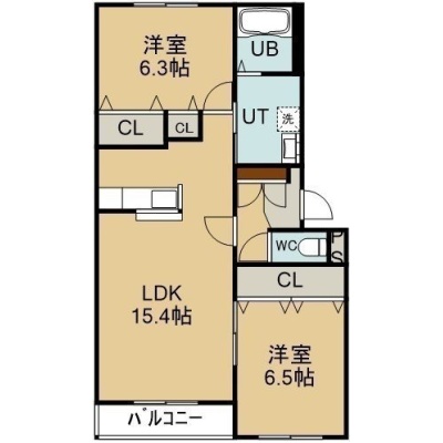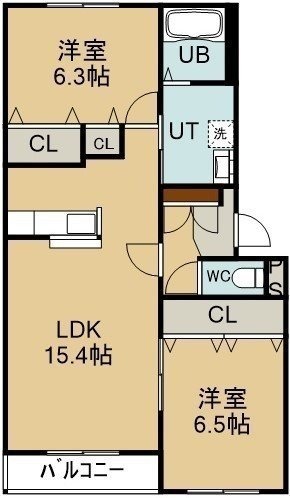 2LDK(61.71m²)└ 4階:LDK15.4帖 洋室6.5帖 洋室6.3帖