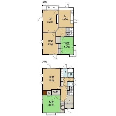 4LDK(116.28m²)└ 1階:洋室9.8帖 和室8帖 / 2階:LDK16.5帖 洋室8.1帖 和室6帖