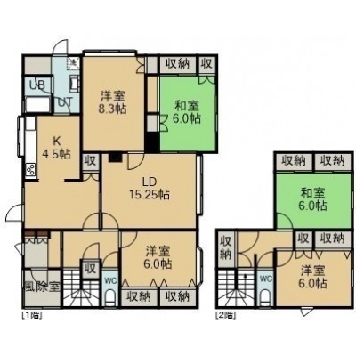 5LDK(134.35m²)└ 1階:LD15.25帖 K4.5帖 洋室8.35帖 洋室6帖 和室6帖 / 2階:洋室6帖 和室6帖