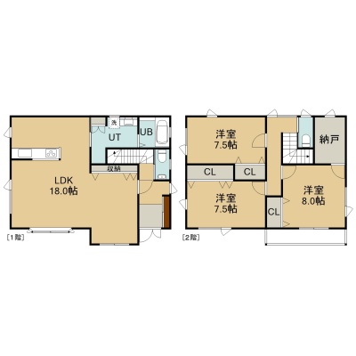 3LDK(118.41m²)└ 1階:LDK18帖 / 2階:洋室8帖 洋室7.5帖 洋室7.5帖