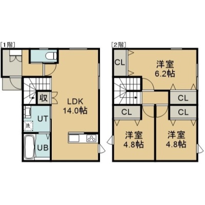 3LDK(75.35m²)└ 1階:LDK14帖 / 2階:洋室6.2帖 洋室4.8帖 洋室4.8帖