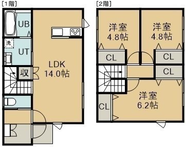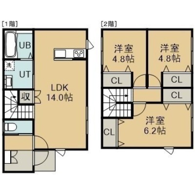 3LDK(75.33m²)└ 1階:LDK14帖 / 2階:洋室6.2帖 洋室4.8帖 洋室4.8帖