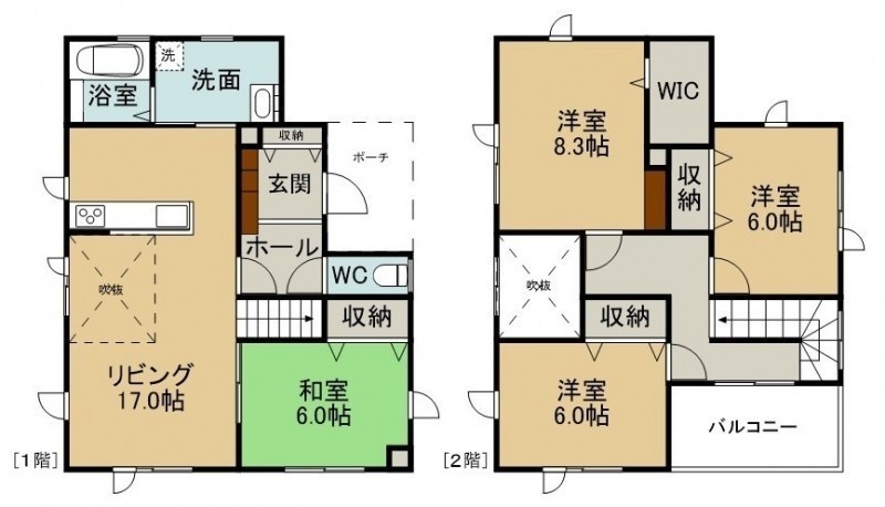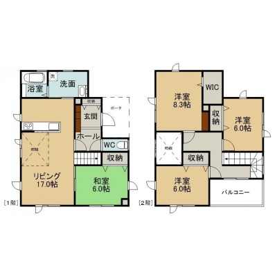 4LDK(106.82m²)└ 1階:LDK17帖 和室6帖 / 2階:洋室8.3帖 洋室6帖 洋室6帖