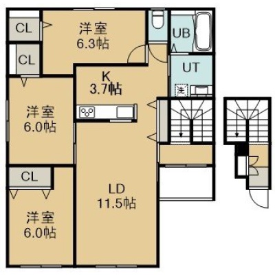 3LDK(74.63m²)└ 2階:LD11.5帖 K3.7帖 洋室6.3帖 洋室6帖 洋室6帖