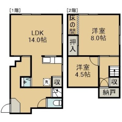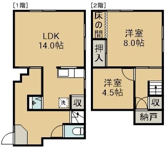 2LDK(66.58m²)└ 1階:LDK14帖 / 2階:洋室8帖 洋室4.5帖