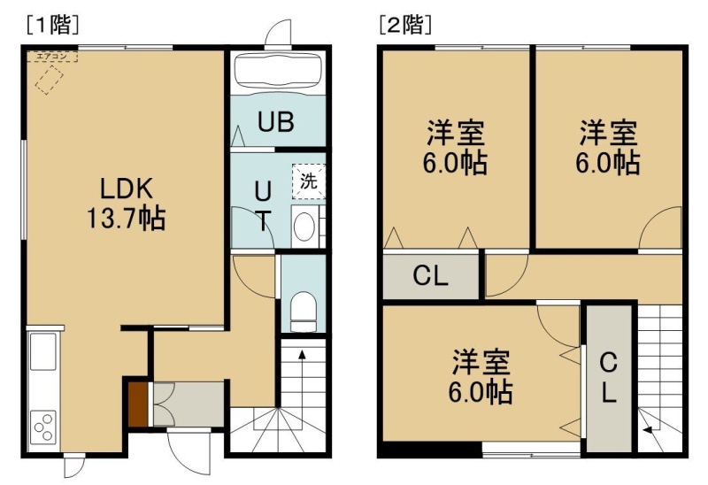 3LDK(79.34m²)└ 1階:LDK13.7帖 / 2階:洋室6帖 洋室6帖 洋室6帖