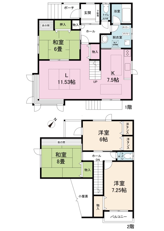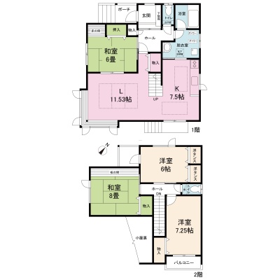 | 間取り | 4LDK1階:LD11.53帖 K7.5帖 和室6帖 / 2階:和室8帖 洋室7.25帖 洋室6帖 |