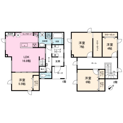 | 間取り | 1階:LDK16.8帖 洋室5.5帖 / 2階:洋室7帖 洋室6帖 洋室4帖 S3帖 |