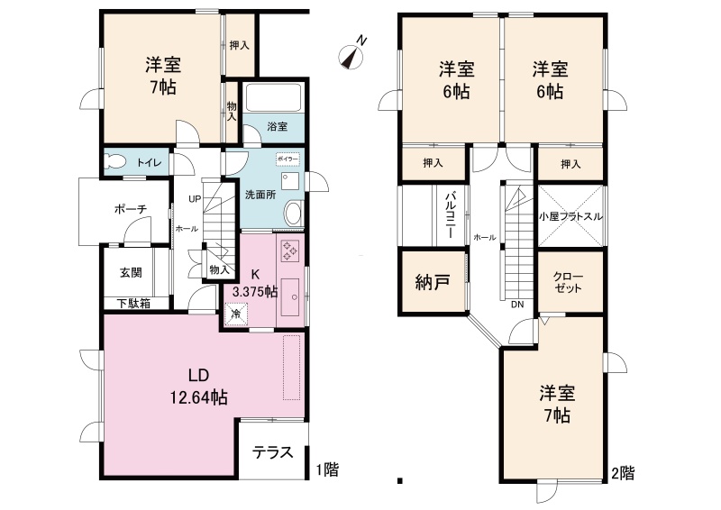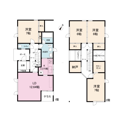 | 間取り | 4LDK1階:LD12.64帖 K3.37帖 洋室7帖 / 2階:洋室7帖 洋室6帖 洋室6帖 |