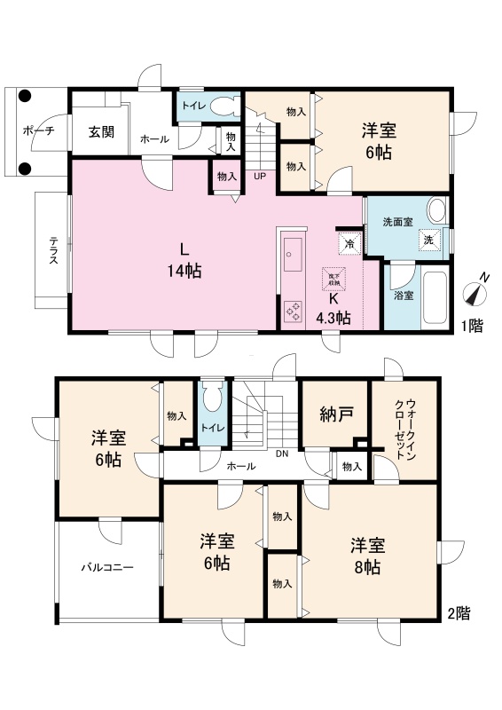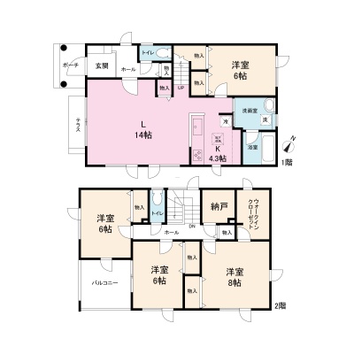 | 間取り | 4LDK1階:LD14帖 K4.3帖 洋室6帖 / 2階:洋室8帖 洋室6帖 洋室6帖 |