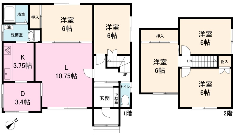 | 間取り | 5LDK1階:L10.75帖 洋室6帖 洋室6帖 / 2階:洋室6帖 洋室6帖 洋室6帖 / その他:D3.4帖 K3.75帖 |