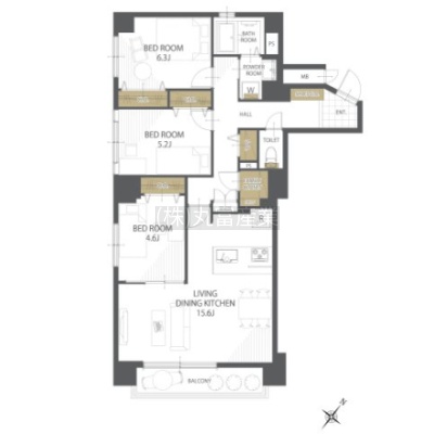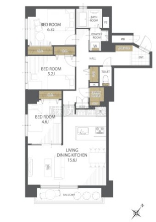 3LDK(79.54m²)└ LDK15.6帖 洋室4.6帖 洋室5.2帖 洋室6.3帖