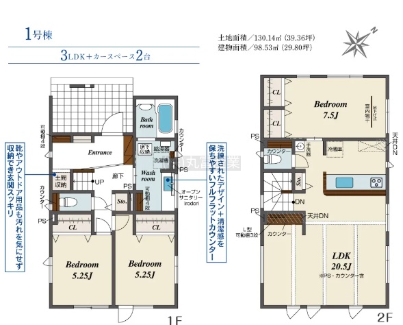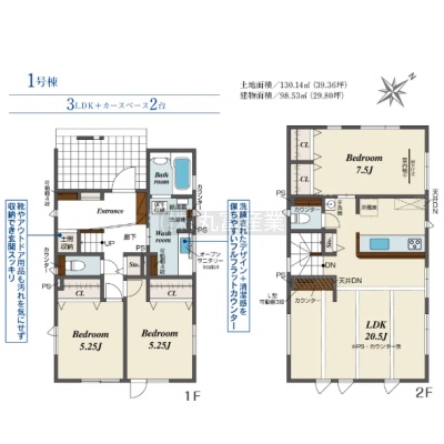 | 間取り | 3LDK1階:洋室5.25帖 洋室5.25帖 / 2階:LDK20.5帖 洋室7.5帖 |