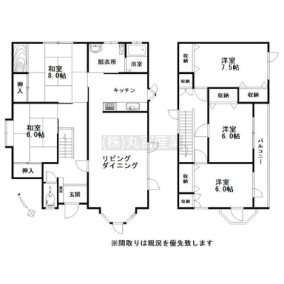 | 間取り | 5LDK1階:LDK 和室6帖 和室8帖 / 2階:洋室6帖 洋室6帖 洋室7.5帖 |