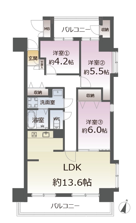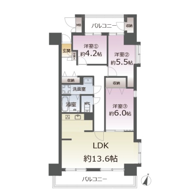 3LDK(72.51m²)└ 4階:LDK13.6帖 洋室6帖 洋室5.5帖 洋室4.2帖