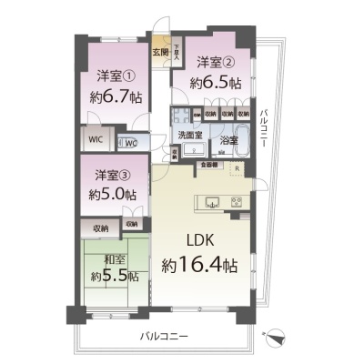 4LDK(84.95m²)└ 3階:LDK16.4帖 和室5.5帖 洋室5帖 洋室6.7帖 洋室6.5帖