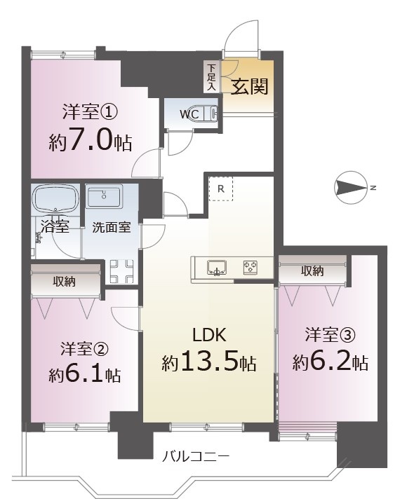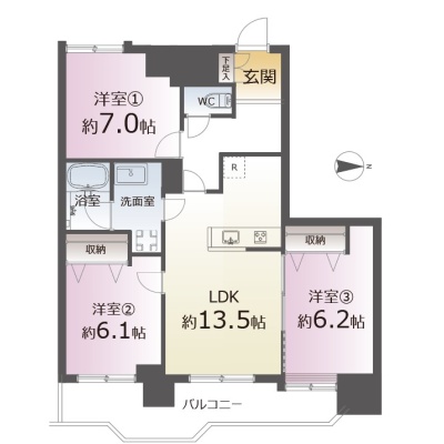 3LDK(74.24m²)└ 13階:LDK13.5帖 洋室7帖 洋室6.1帖 洋室6.2帖