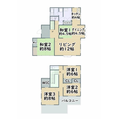 | 間取り | 5LDK1階:LD12帖 K4帖 D4.5帖 和室4.5帖 和室8帖 / 2階:洋室6帖 洋室8帖 洋室6帖 |