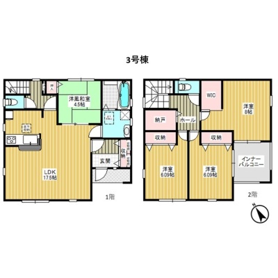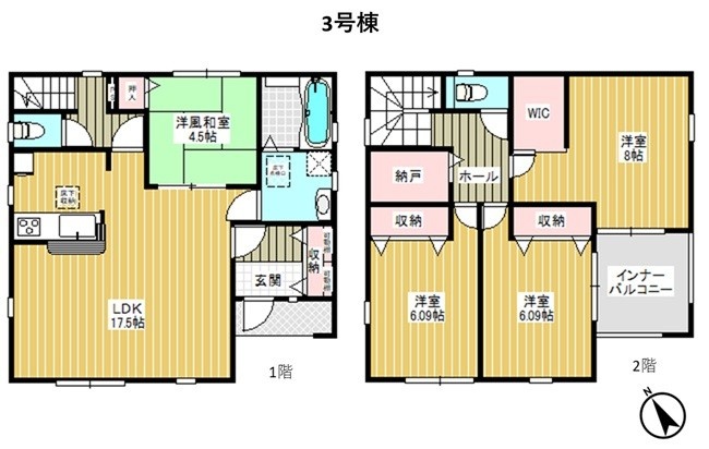| 間取り | 4LDK1階:LDK17.5帖 和室4.5帖 / 2階:洋室8帖 洋室6.09帖 洋室6.09帖 |