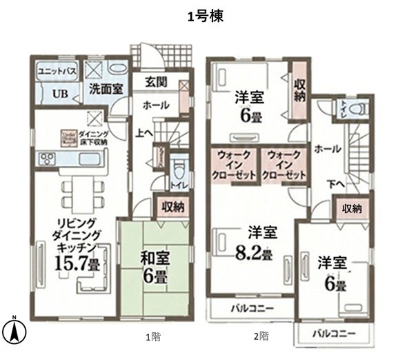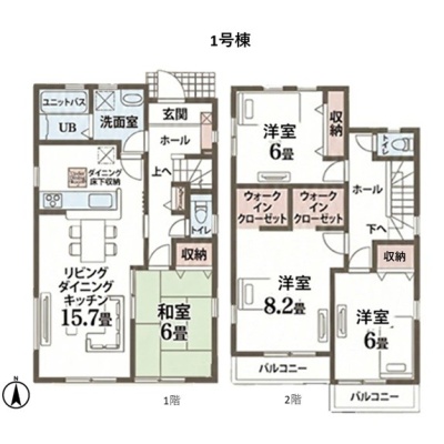 | 間取り | 4LDK1階:LDK15.7帖 和室6帖 / 2階:洋室8.2帖 洋室6帖 洋室6帖 |