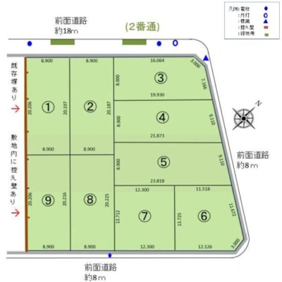 備考 * 2025年9月末までに既存建築物の解体作業を完了し、その後 確定測量を実施し境界を確定させます。 * 上記面積は分筆予定面積のため、登記後に面積・寸法の変動が 生じる場合がありますが、販売価格に変更はございません。 * ①⑨区画には左図の通り既存の塀及び付属の控え壁が存在します。 * 電柱の位置、縁石切り下げの位置は測量前の為、現況の位置を 予想して左図に表記しております。 学区色がついているアイコンをクリックすると、本物件までの道順を見ることができます。