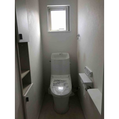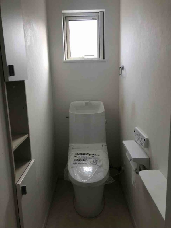 新しい便器に交換済みです。壁の厚みを利用した埋め込み収納は、トイレットペーパーや掃除用品などをすっきりと収納できます。