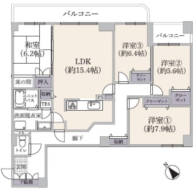 4LDK(107.35m²)└ 4階:LDK15.4帖 洋室7.9帖 洋室5.6帖 洋室6.4帖