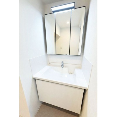三面鏡収納付きミラーキャビネット。鏡の裏はたっぷり収納スペ…