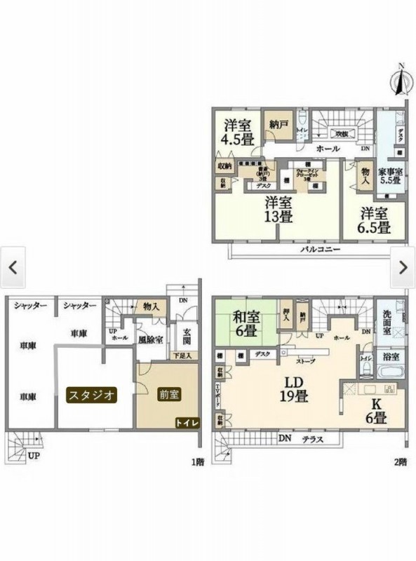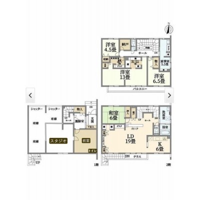 1階 車庫、前室、スタジオ約10帖 2階 LD19帖、K6帖、和室6帖…