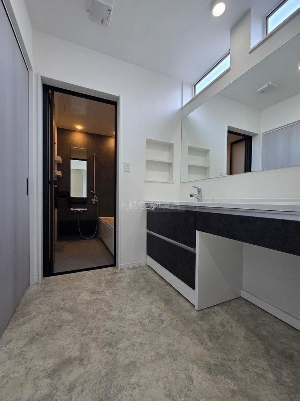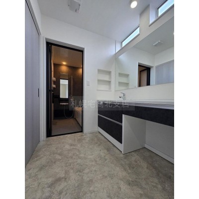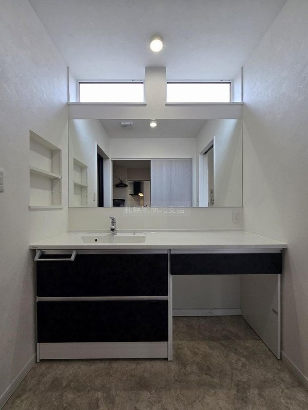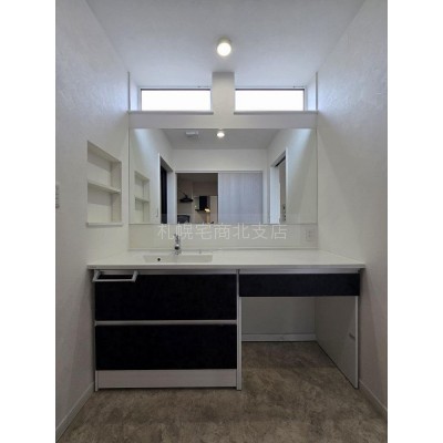 広々洗面化粧台です。イスを設置すればメイクもゆったり。