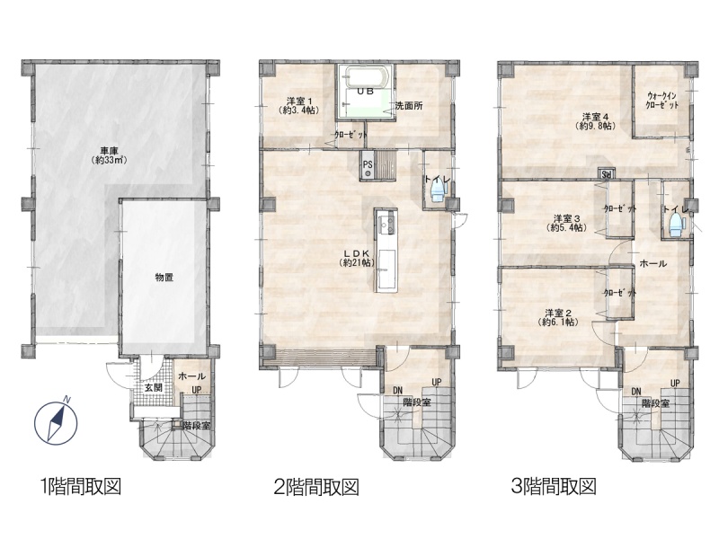 | 間取り | 4LDK2階:LDK21帖 洋室3.4帖 / 3階:洋室6.1帖 洋室5.4帖 洋室9.8帖 |