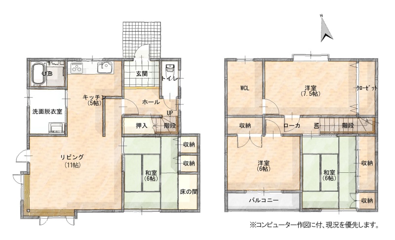 | 間取り | 4LDK1階:LD11帖 K5帖 和室6帖 / 2階:洋室7.5帖 洋室6帖 和室6帖 |