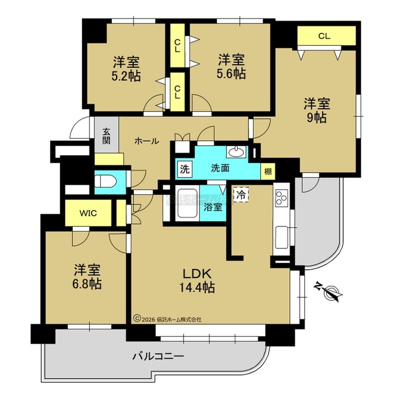4LDK(90.71m²)└ LDK14.4帖 洋室9帖 洋室6.8帖 洋室5.6帖 洋室5.2帖
