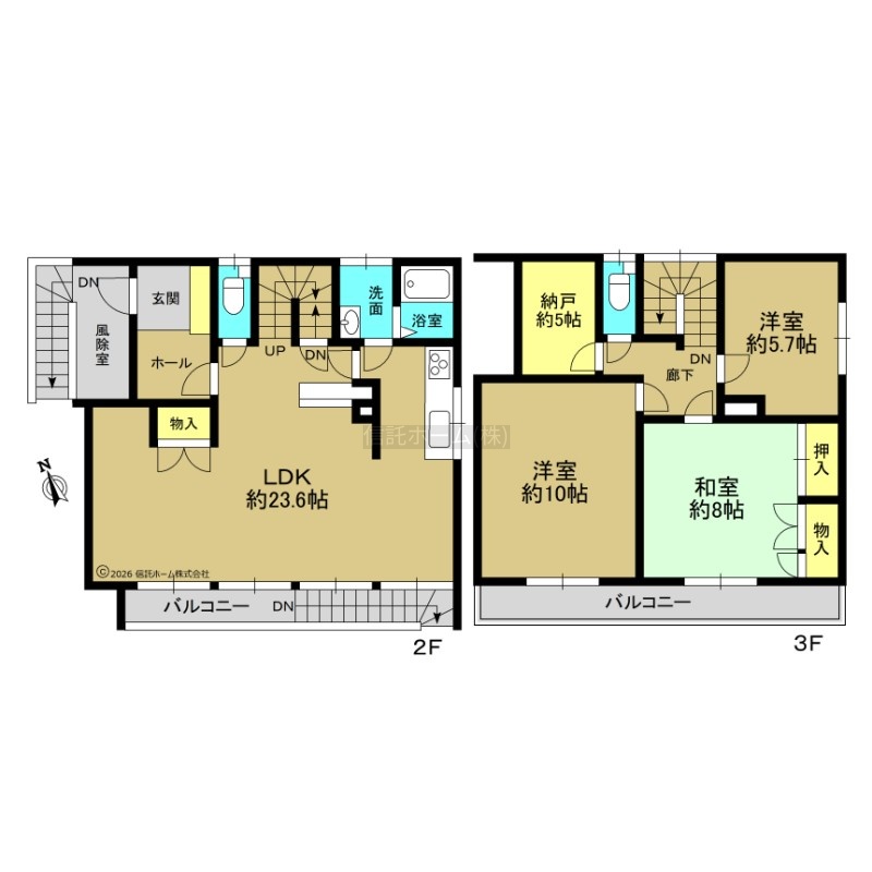 | 間取り | 3SLDK2階:LDK23.6帖 / 3階:洋室10帖 洋室5.7帖 和室8帖 S5帖 |