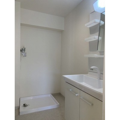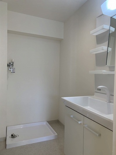 洗面所には洗濯機置き場もしっかり確保。洗濯水栓も新品です!